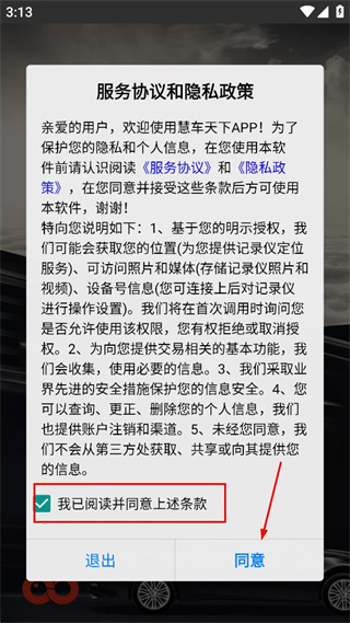 1、打开慧车天下,勾选服务协议和隐私政策里的同意选项,点击界面中的同意按钮。