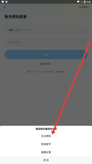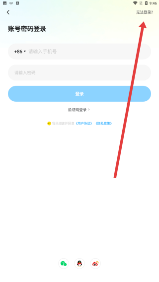 1、在登录页面中,若忘记密码了可以点击右上角的无法登陆按钮。