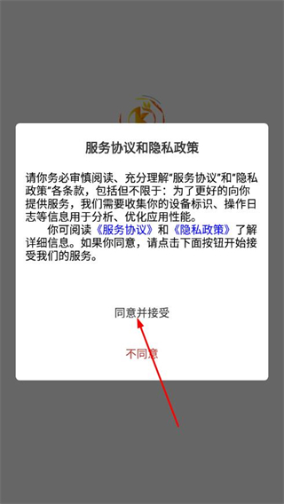 1、打开康养技师应用,在弹出的服务协议和隐私政策提示框中,点击同意并接受。