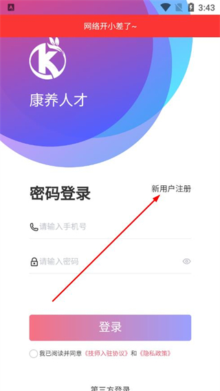 3、在密码登录页面,点击新用户注册选项,即可进入注册流程。