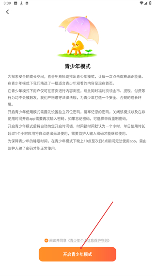 4、在青少年模式页面,勾选阅读并同意选项后,点击开启青少年模式按钮完成开启。