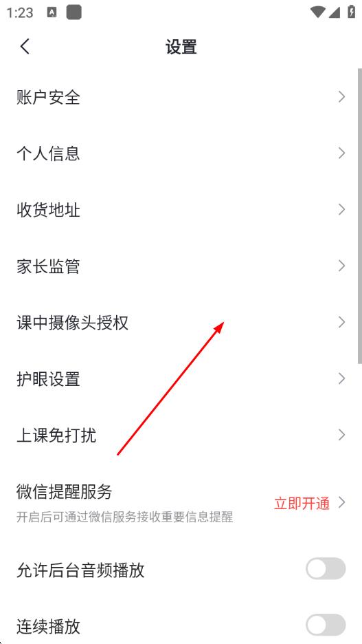 3、在设置页面中,找到并点击课中摄像头授权选项。