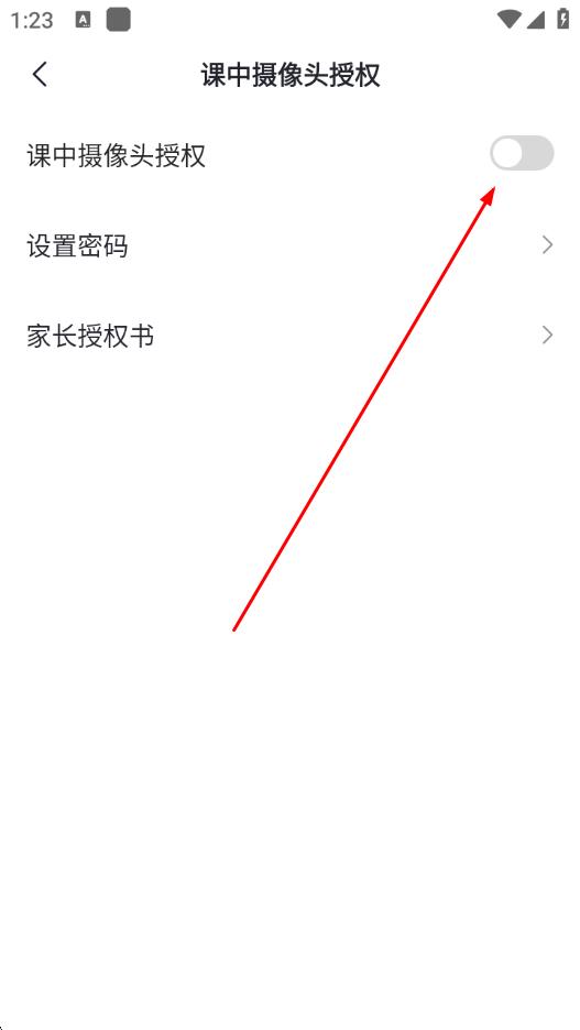 4、在课中摄像头授权页面,点击课中摄像头授权右侧的开关按钮,将其开启。