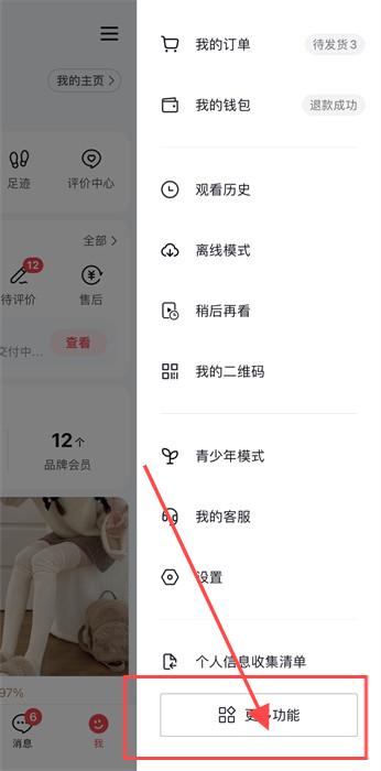 3、接着,点击【我的】页面,找到右上角的三条杠,并找到最下方【更多功能】,如下图;
