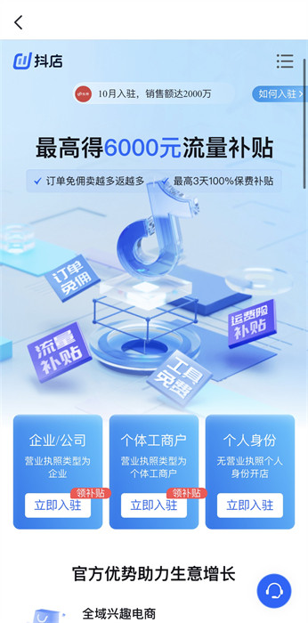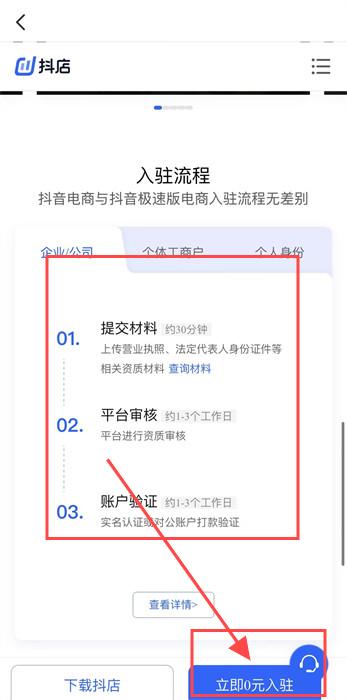 6、找到最下方关于不同群体入驻的流程,了解之后,点击下方蓝色按钮【立即0元入驻】;