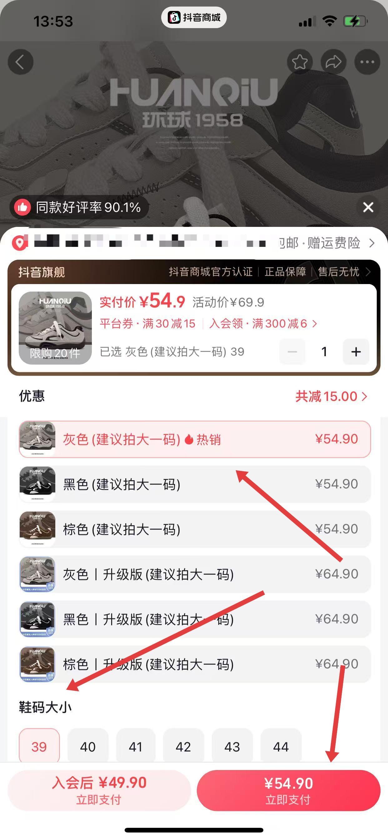 2、进入规格选择页,选定颜色、鞋码等信息,点击立即支付。