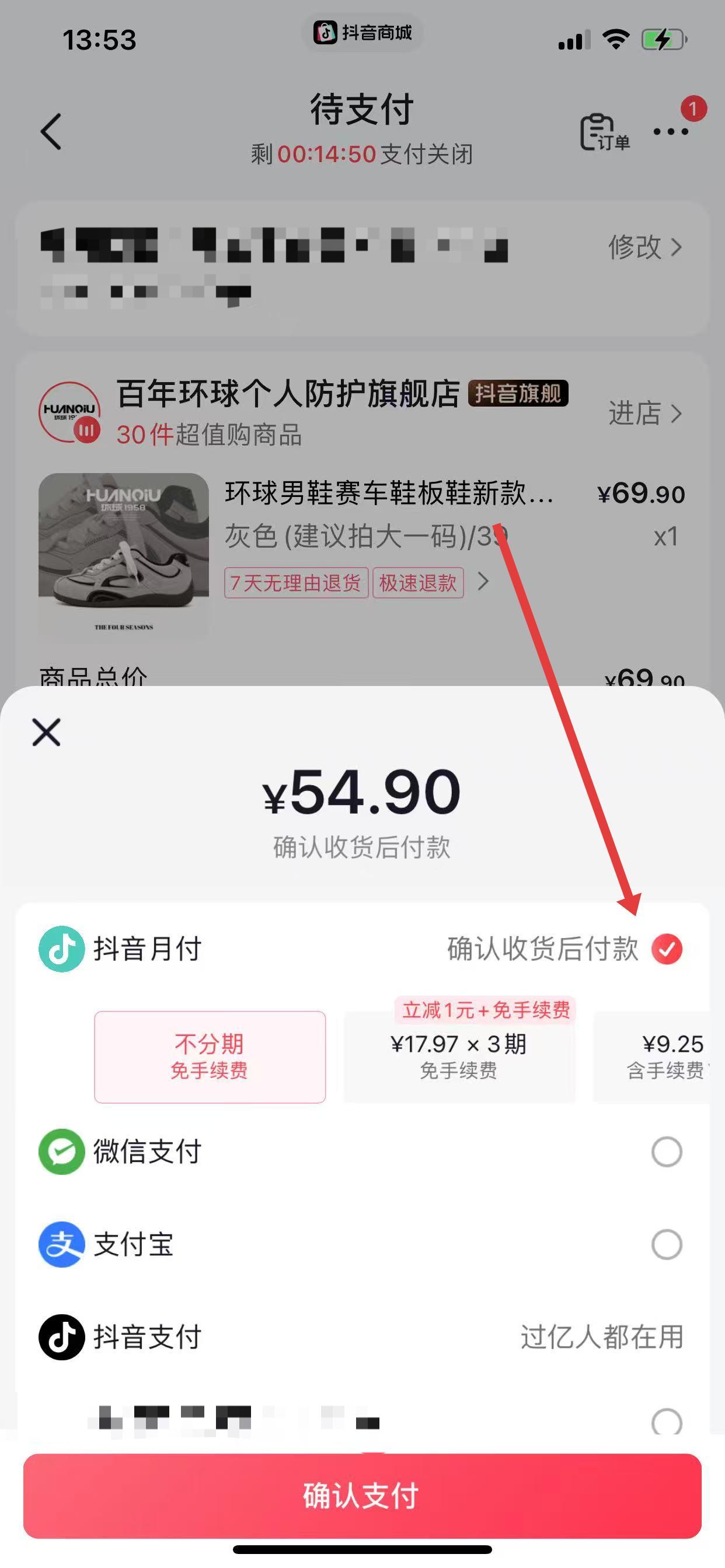 3、跳转至待支付界面,点击支付方式区域,在弹出列表里勾选抖音月付。