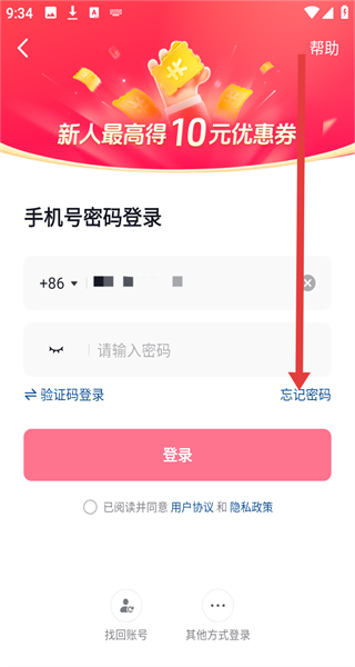 3、在切换到手机号密码登录界面,若忘记了密码,可以点击下方忘记密码按钮解决。