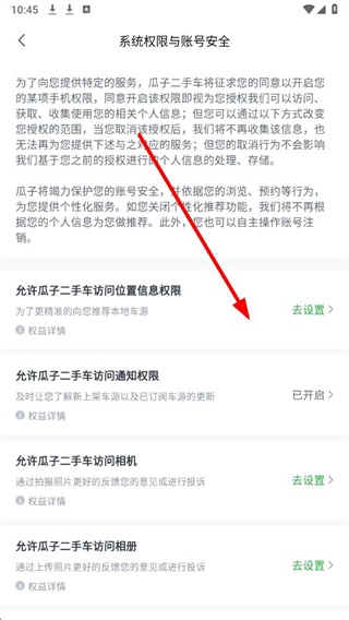 4、在该页面可看到各类权限,点击对应权限右侧的去设置,即可进入系统调整权限。