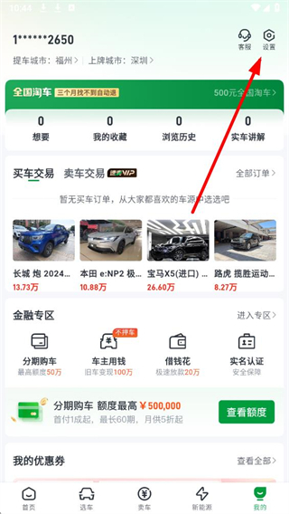 1、打开瓜子二手车app,点击底部导航栏中的我的选项,进入个人页面后点击页面右上角的设置图标。