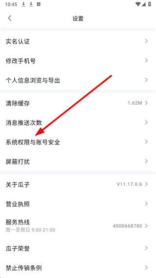 3、在系统权限与账号安全界面里,下滑找到注销瓜子账号选项,点击去注销,按照页面提示完成身份验证等流程,确认注销账号即可。
