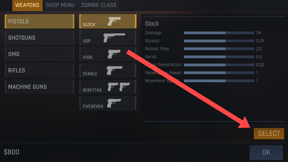 3、进入游戏后打开商店挑选心仪的枪械,挑选完毕后点击SELECT购买。