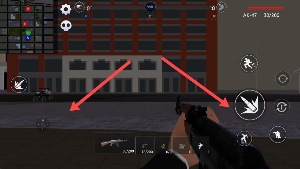 3、开始游戏的时候左下角是控制方向的,右下角是控制武器攻击还有人物跳跃、换弹等。