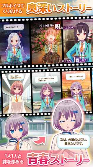 1、角色羁绊养成:能与三十位主人公建立羁绊,剧情由豪华声优全语音演绎,搭配Live2D制造的可爱少女立绘,随着羁绊加深还有专属于两人的对话。