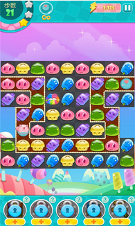 2、移动美食完成消除:通过移动相邻美食,使三个及以上相同美食连成一线完成消除,不断消除美食来达成关卡目标。