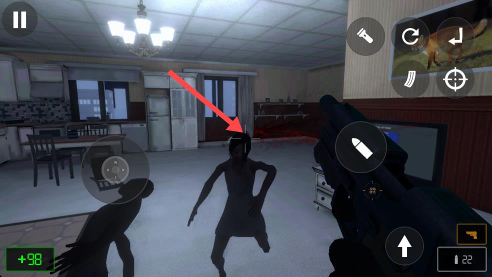 1、精准射击对抗僵尸:进入游戏后玩家需时刻保持警惕,面对蜂拥而至的僵尸通过滑动屏幕调整视角,点击射击按钮进行精准打击。