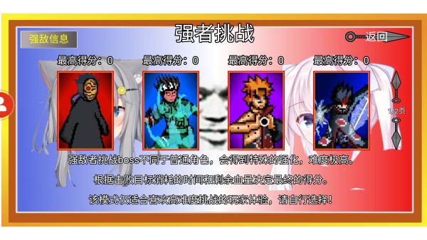 3、模式选择挑战:剧情模式体验原创故事线,BOSS战考验操作与策略;无尽模式挑战极限生存,与不断变强的敌人对战;还可尝试变身模式,体验角色超神状态下的碾压式战斗。