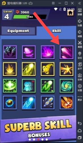 3、技能组合与角色成长:升级后从3个随机技能中选择1个,包含“火焰冲击”“冰冻新星”“分裂箭”等特效技能。