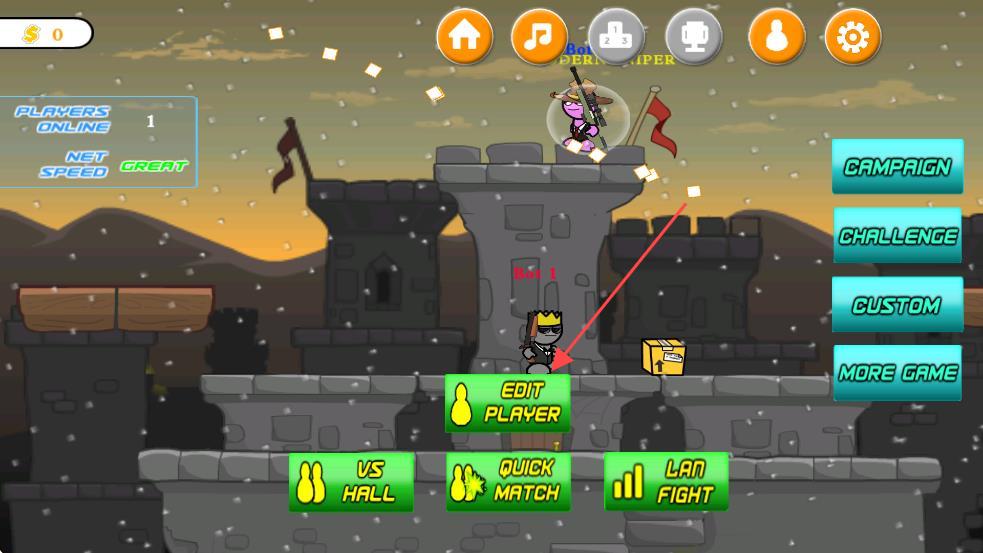 1、移动射击与场景利用:通过虚拟摇杆控制火柴人移动,滑动屏幕调整射击角度,利用场景掩体(木箱障碍物)躲避敌方火力,绕后攻击敌人。