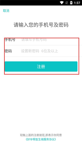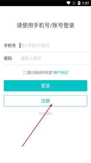 2、进入注册页后,填写手机号并设置密码,点击注册。