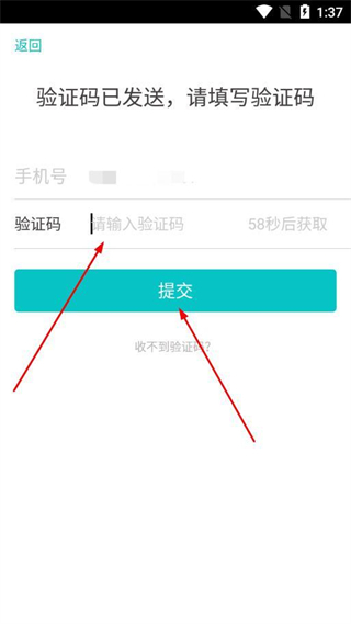 3、在验证码填写页,输入收到的验证码后点击提交,完成账号注册。