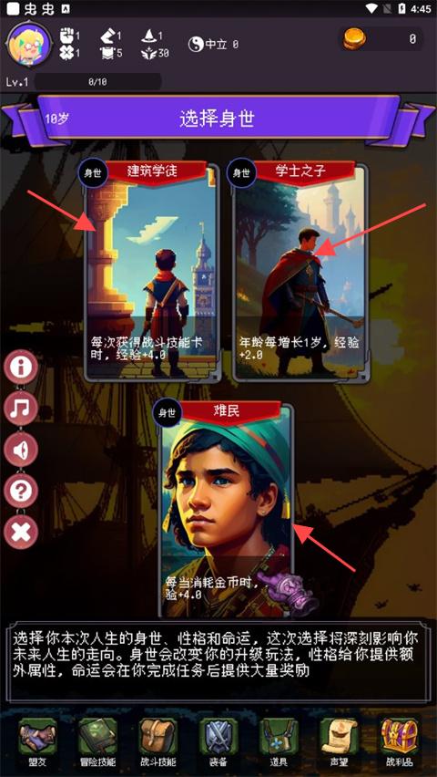 3、轮回养成系统:每次人生结束后可学习天赋升星盟友,使下一次冒险更顺畅,如提升经验获取速度或解锁更多技能槽,结合身世性格命运卡的随机组合,打造个性化的成长路线。