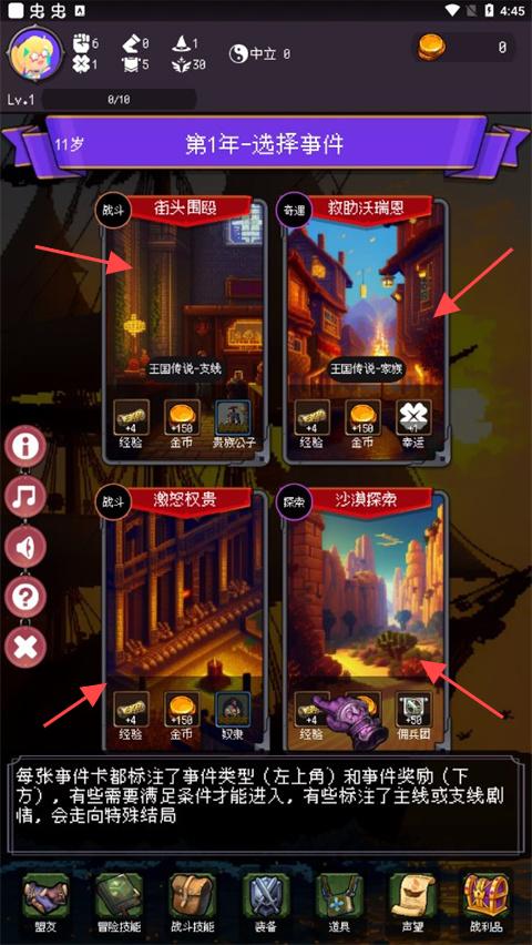 3、丰富事件探索:包含解谜卡牌决斗养成等多元玩法,新手可通过刷新开局卡选择合适身世性格命运,逐步解锁奇遇修炼等内容,体验中世纪人生的多样可能。