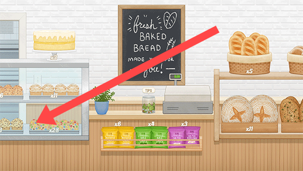1、进入面包店界面,点击箭头所指的糕点(如展示柜中标识“x28”的商品),熟悉商品陈列与数量查看。