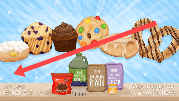 2、依照箭头方向,选用【REALINGREDIENTS】(如面粉、糖等原料)制作【BAKEtreatsforyourCUSTOMERS】所需的糕点。