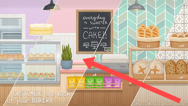 3、根据提示【CUSTOMIZEthelook0fyourBAKERY】,按箭头指引操作,尝试装饰面包店,提升店铺外观。