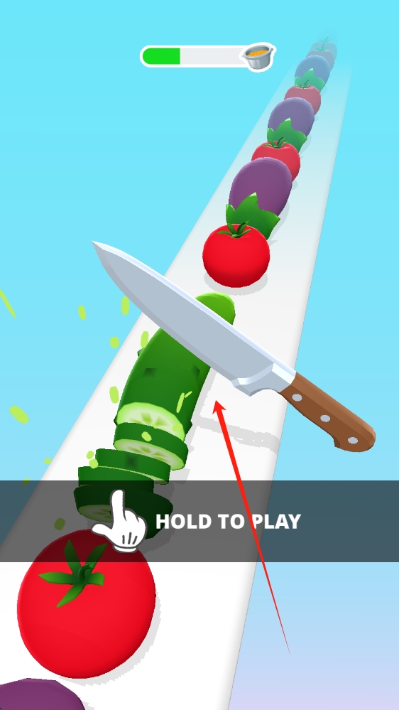 2、按住鼠标切菜,优先解锁切割范围广、特效加成高的刀具,后期关卡中大范围切割可有效应对密集食材流。