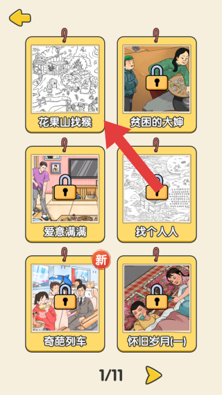 1、展示了多个关卡,根据提示可选择第一个关卡,部分关卡带有锁的图标表示未解锁,底部显示1/11,表明总共有11个关卡。