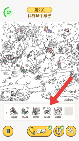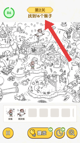2、根据任务提示【找到16个猴子】,在图片中进行寻找,包含多种元素与角色,底部有提示等功能按钮,整体呈现出休闲找物类的特征。