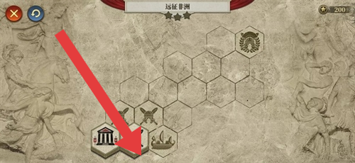 1、进入游戏地图界面(如“远征非洲”场景),点击红色箭头指向的建筑图标(如资源或军事设施),解锁新功能或区域。
