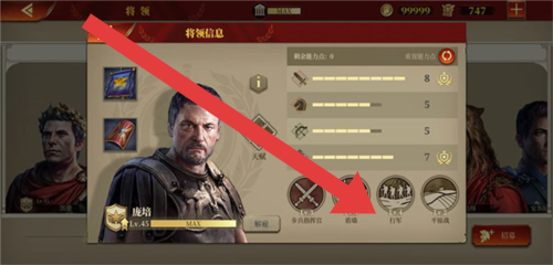 2、在将领信息界面(以“庞培”为例),聚焦红色箭头指向的将领技能(如“战略”“行军”等属性),通过升级、搭配天赋提升将领战力。
