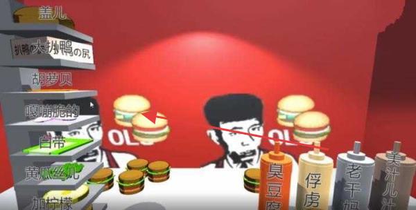 3、按箭头指引,从酱料瓶(如“臭豆腐”“俘虏”)中选择酱料添加到汉堡,完成个性化汉堡制作,满足游戏任务要求。