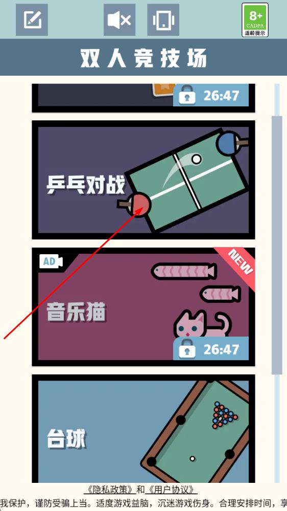 1、开启游戏后,映入眼帘的是游戏模式选择界面,轻点你钟情的小游戏图标,如乒乓对战,即可进入对战准备界面,等待好友就位。