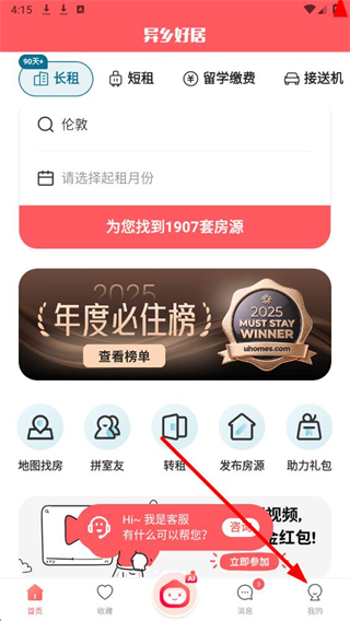 1、打开异乡好居app,点击底部导航栏中的我的图标,进入个人界面。