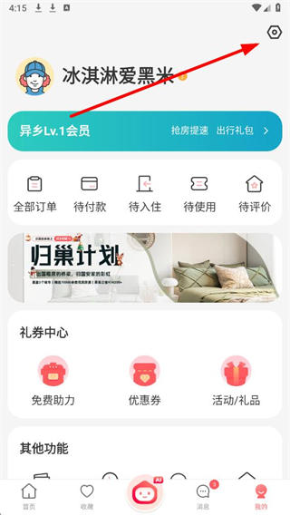 1、在异乡好居app我的页面,点击右上角设置图标,进入设置界面。