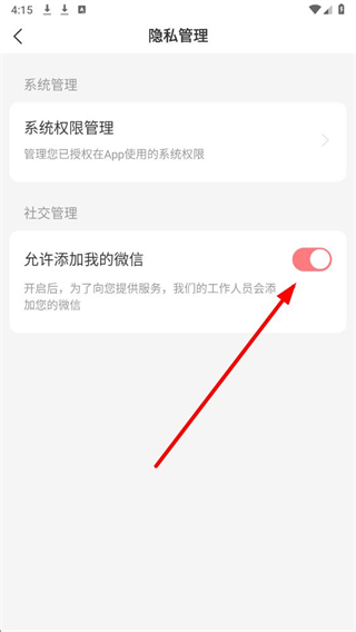 4、在隐私管理页面,找到允许添加我的微信对应的开关按钮,点击将其关闭。