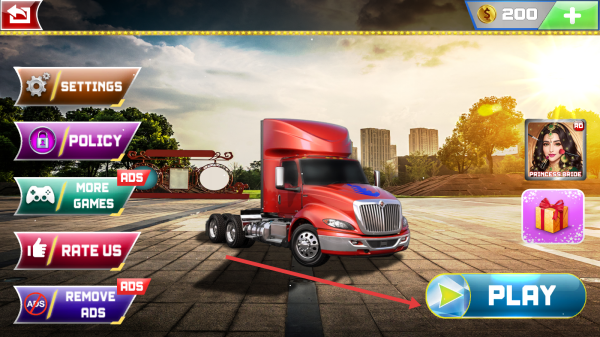 1、在游戏初始界面,点击右下角的【PLAY】按钮,进入卡车选择界面。