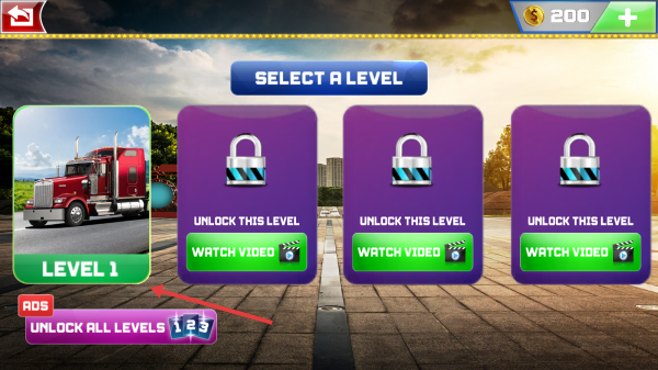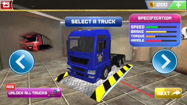 2、在卡车选择界面,选择蓝色卡车后,点击箭头所指的【NEXT】按钮,进入关卡选择界面。
