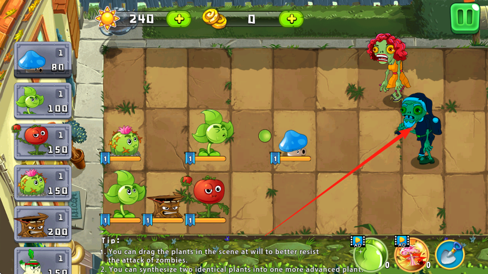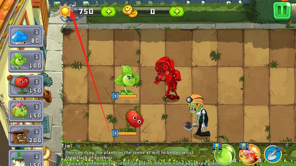 2、战斗操作体系:僵尸进入攻击范围后自动触发植物攻击,拖动植物可实时调整位置应对多方向威胁,点击道具图标瞬间释放辅助效果。