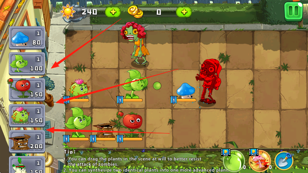 1、资源管理循环:点击向日葵收集阳光,滑动屏幕快速种植植物,长按植物可查看详细属性,通过合成系统提升植物星级。
