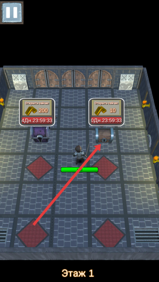 2、进入第1层地图,按箭头指向移动角色靠近发光宝箱,点击确认消耗金币或钥匙等资源开启,获取装备、金币等奖励。