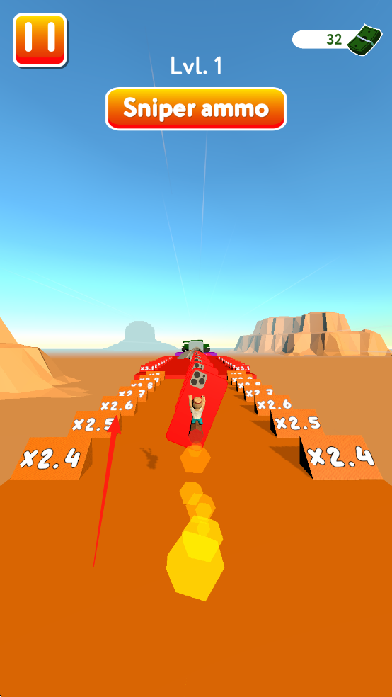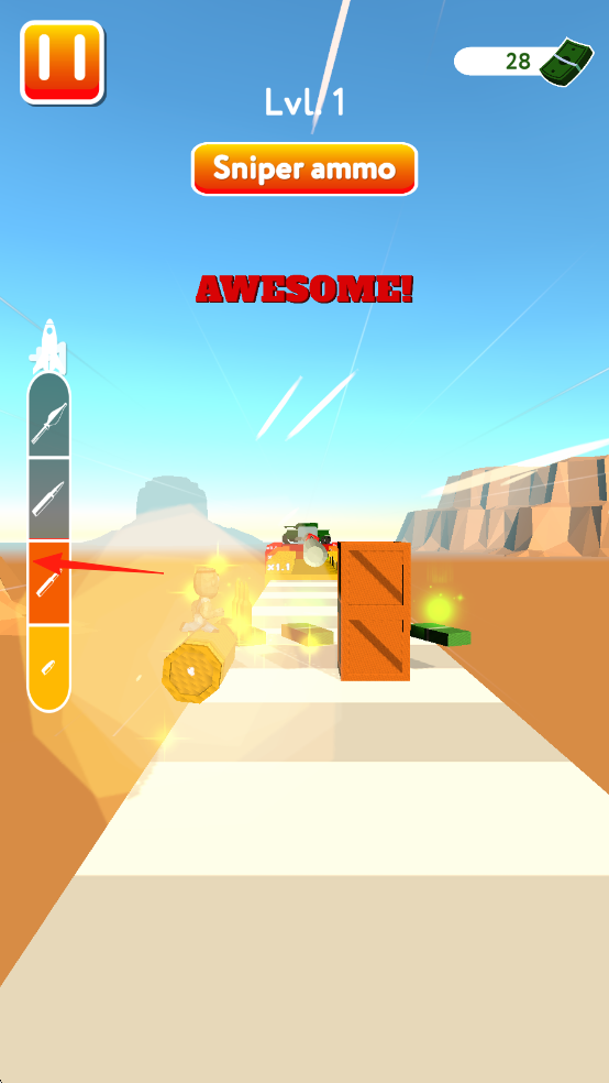 3、临近终点时利用火箭弹的强大威力冲刺,根据最终子弹体积与收集的钱币数量,决定撞击终点目标的距离与奖励等级。