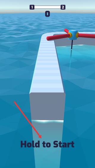 1、在初始界面长按“HoldtoStart”,让角色(隐含)从平台起跑,进入水上障碍赛道。