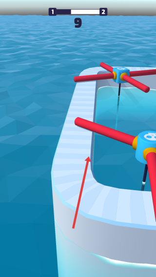 2、角色奔跑时,需精准把握时机,躲避旋转红杆等障碍,沿赛道推进,上方数字(如9)记录进度。