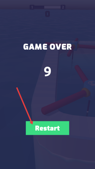 3、若角色碰撞障碍落水,显示“GAMEOVER”,点击“Restart”重新挑战该关卡。