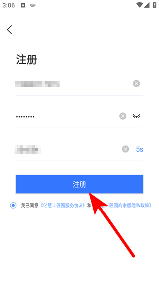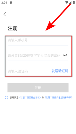3、勾选服务协议与隐私政策后,点击注册完成亿慧工匠园账号注册。